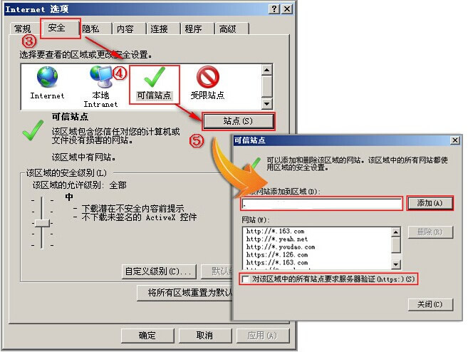 ⑤在“可信站點(diǎn)”的設(shè)置中,點(diǎn)擊“站點(diǎn)”,在彈出的站點(diǎn)窗口中輸入我們的網(wǎng)址如“http://
